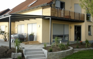Balkongeländer aus Edelstahl 1.4301 bestehend aus Pfosten d=42,4mm, mit Ober- und Unterzug d=25mm, mit senkrechten Stäben Rd=12 mm, in Kombination mit Alu-Blechfeldern vierseitig gekantet, mit Vierkantprägung 10/70, Oberfläche nach RAL-Standard beschichtet, Handlauf d=42,4mm auf Pfosten aufgesetzt.