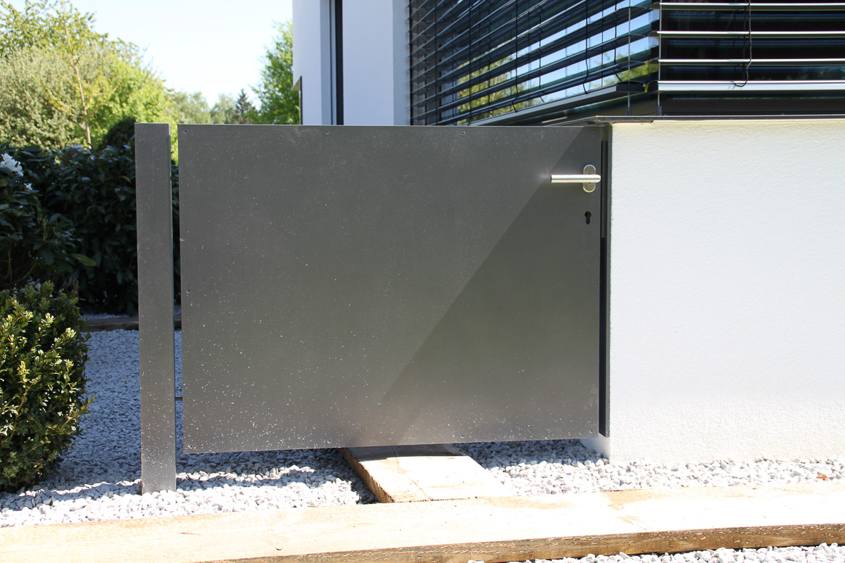 Gartentür bestehend aus Rahmenkonstruktion mit ALU-Blechverkleidung (t=4 mm), Oberfläche nach RAL-Standard beschichtet, inkl. verstellbarer Schaniere, Schloß, und elektrischer Türschließer (elektrischer Anschluss bauseits).